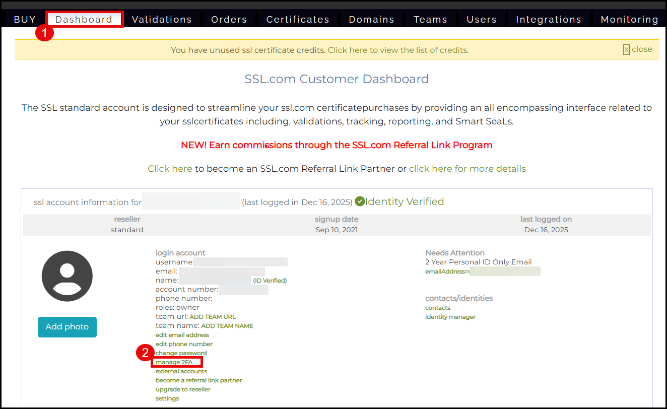 - Click Dashboard from the top menu, then scroll down and click manage 2FA.
