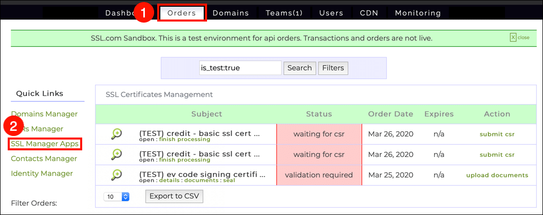 - Navigate to the Orders tab, then click the SSL Manager Apps link.