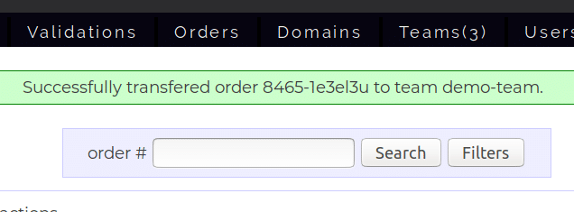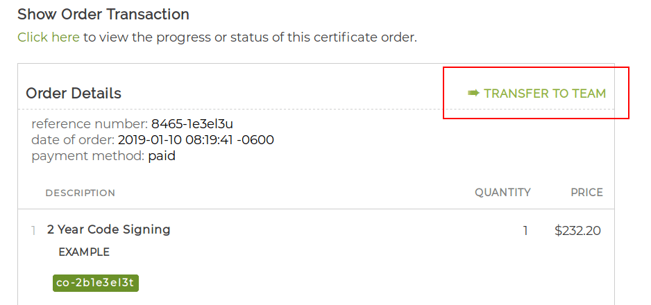 You may use the certificate order’s reference number to filter the transactions until you locate the transaction you wish to transfer to another Team.