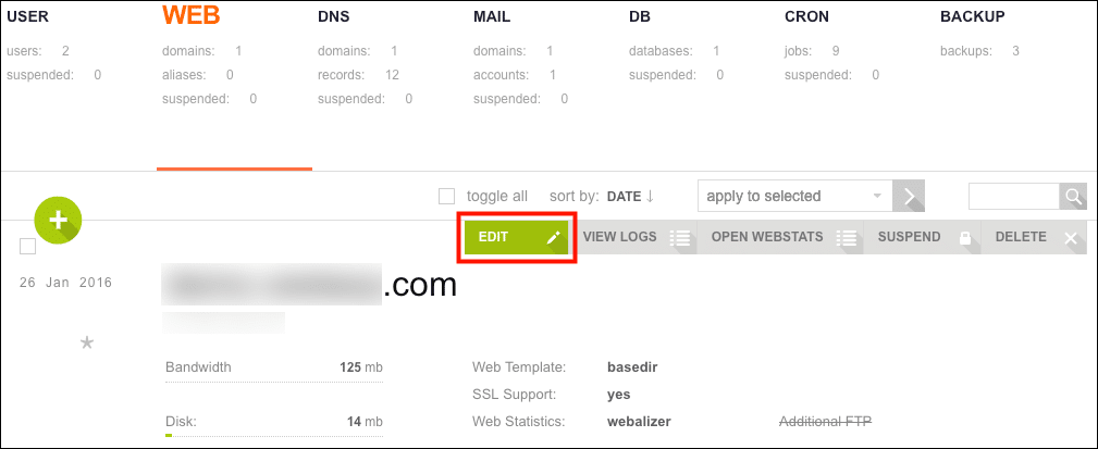 - Scroll down to the domain you want to install a certificate for and hover over it, then click the EDIT button.