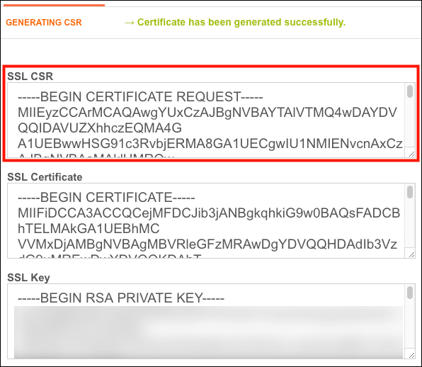 6. A window will appear with fields containing your CSR, a (self-signed) certificate, and your private key. For instructions on submitting your CSR to SSL.com, please read our guide to CSR submission. When you are ready to install your signed certificate, please check our how-to on certificate installation in Vesta Control Panel.
