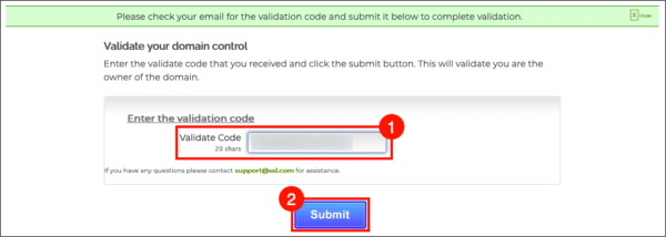- A web page with a form will open. Check your email address for a new message with a 20-character domain validation code. Enter the code into the form field and click the Submit button.