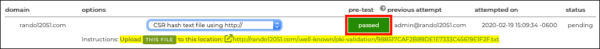 CSR hash text file using http://. Click the small button labeled THIS FILE to download the CSR hash text file, then upload it to your web server in a place where it can be accessed via the URL shown to the right. (You will need to create the/.well-known/pki-validation/directory on your web server if it doesn’t already exist.)The default status of the pre-test is “FAILED.” Don’t Panic. - When you have uploaded the file, click the Validate button.