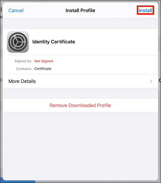 - Tap Install. Note: Even though Mail previously indicated that the certificate was trusted, there still will be a Not Trusted message above the certificate’s expiration date in this step.