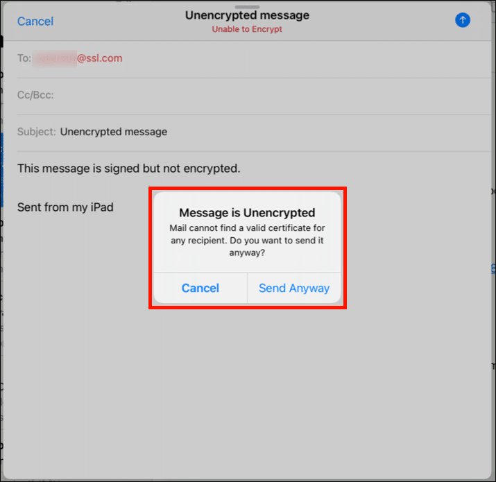 - If you have not installed your recipient’s public key, your message cannot be encrypted, but will still be signed.Note: All outgoing mail will be sent using the default S/MIME signing settings for your account in iOS. You cannot choose not to sign email unless you disable this feature in the account settings. As shown above, message encryption can be toggled on and off.