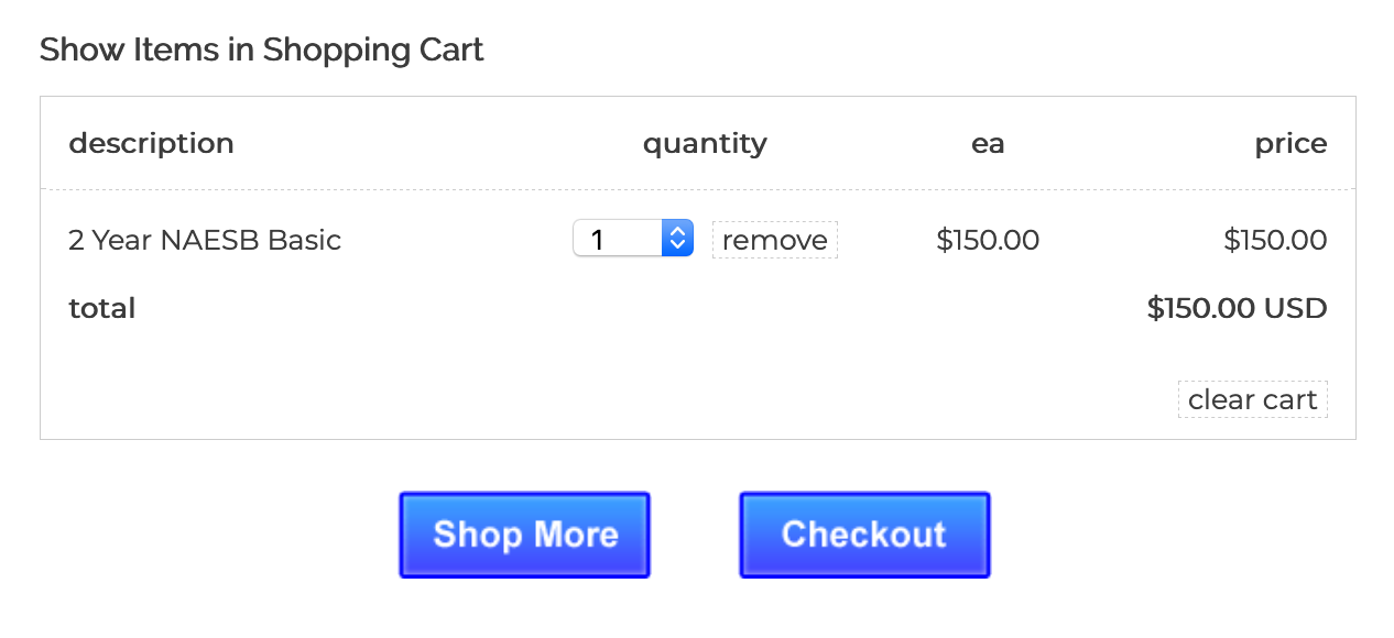 - In the shopping cart, you can change the quantity of NAESB certificates, remove them from your cart, or return to shopping with the Shop More button. When your order is complete and correct, click Checkout.